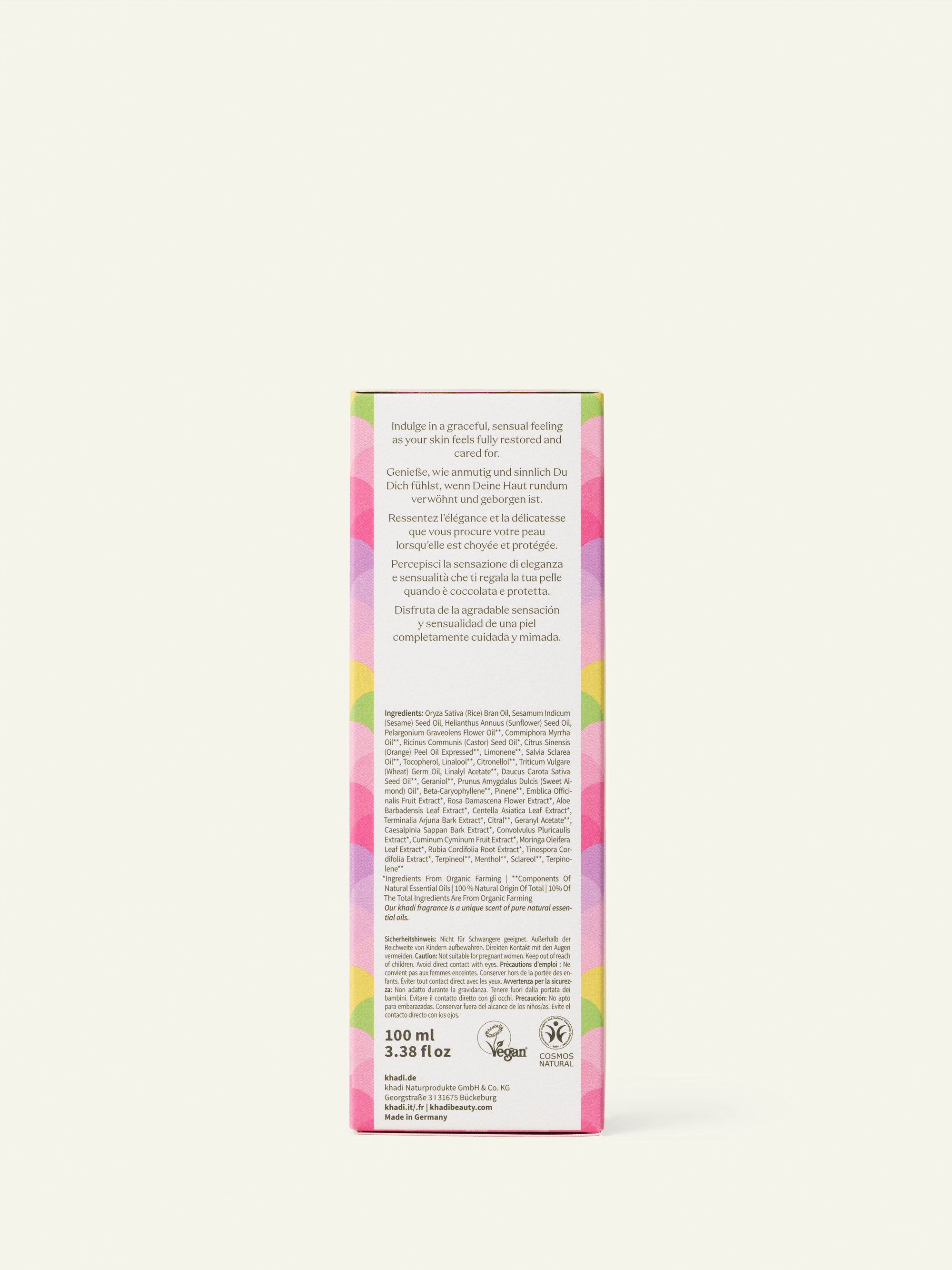 The secret lies in the khadi Rose Elixir—a potent extract made from handpicked herbs, simmered using traditional methods to enhance its healing powers. Up to 20% of the body oil is made from this elixir, compared to just 2-5% in regular oils.