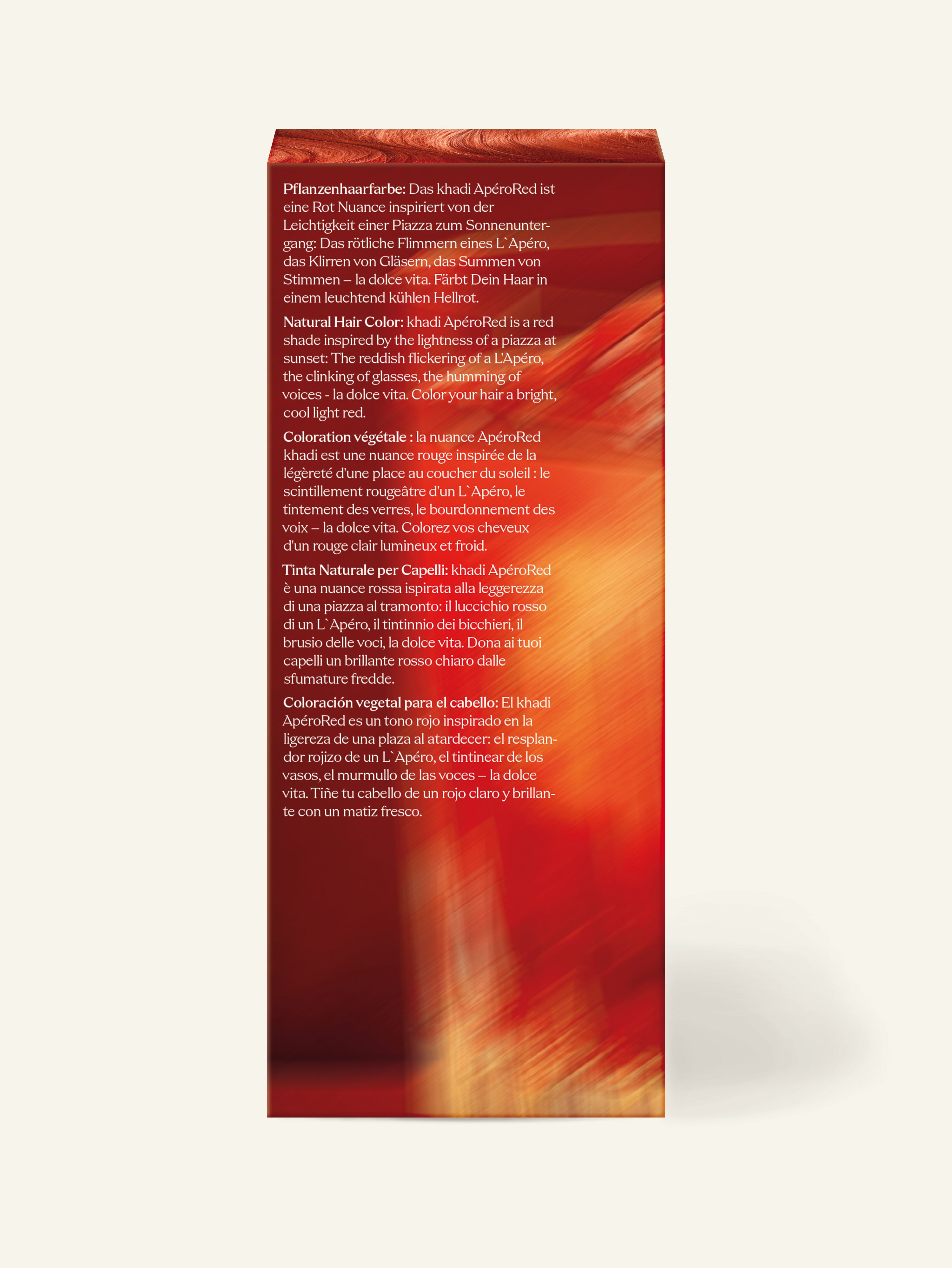 Like the red-gold shimmer of an Aperitif at sunset, ApéroRed unfolds its color nuances in a fascinating interplay. Immediately after rinsing, it glows in vibrant, flowing red tones – warm, radiant, and full of energy.